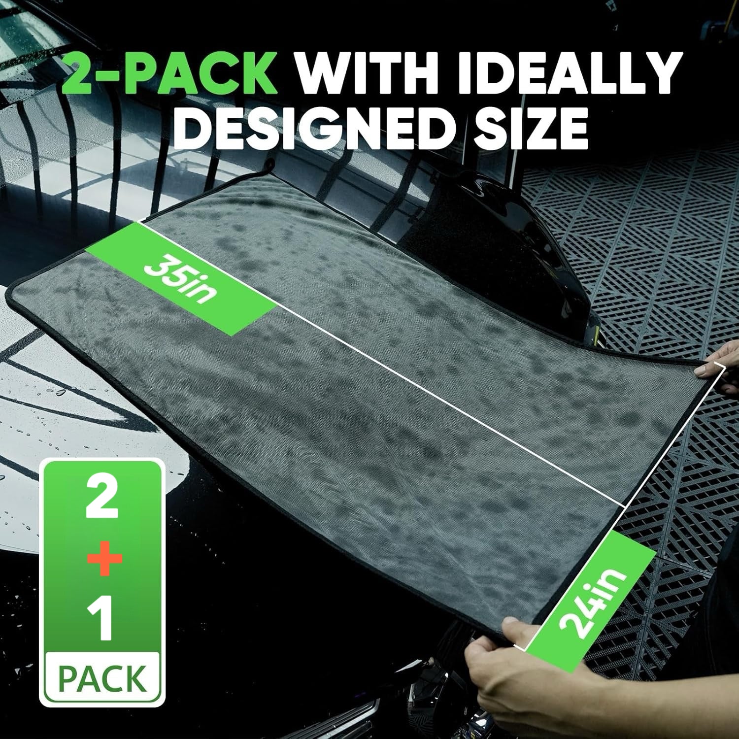 Each package includes 2 extra-large towels (35" × 24") and 1 smaller towel (11.8" × 15.8")—perfect for fast full-vehicle drying and detail work on mirrors, trim, and interior surfaces. The soft, PE-edged design is gentle on paint, glass, and trim, ensuring a scratch-free finish every time.