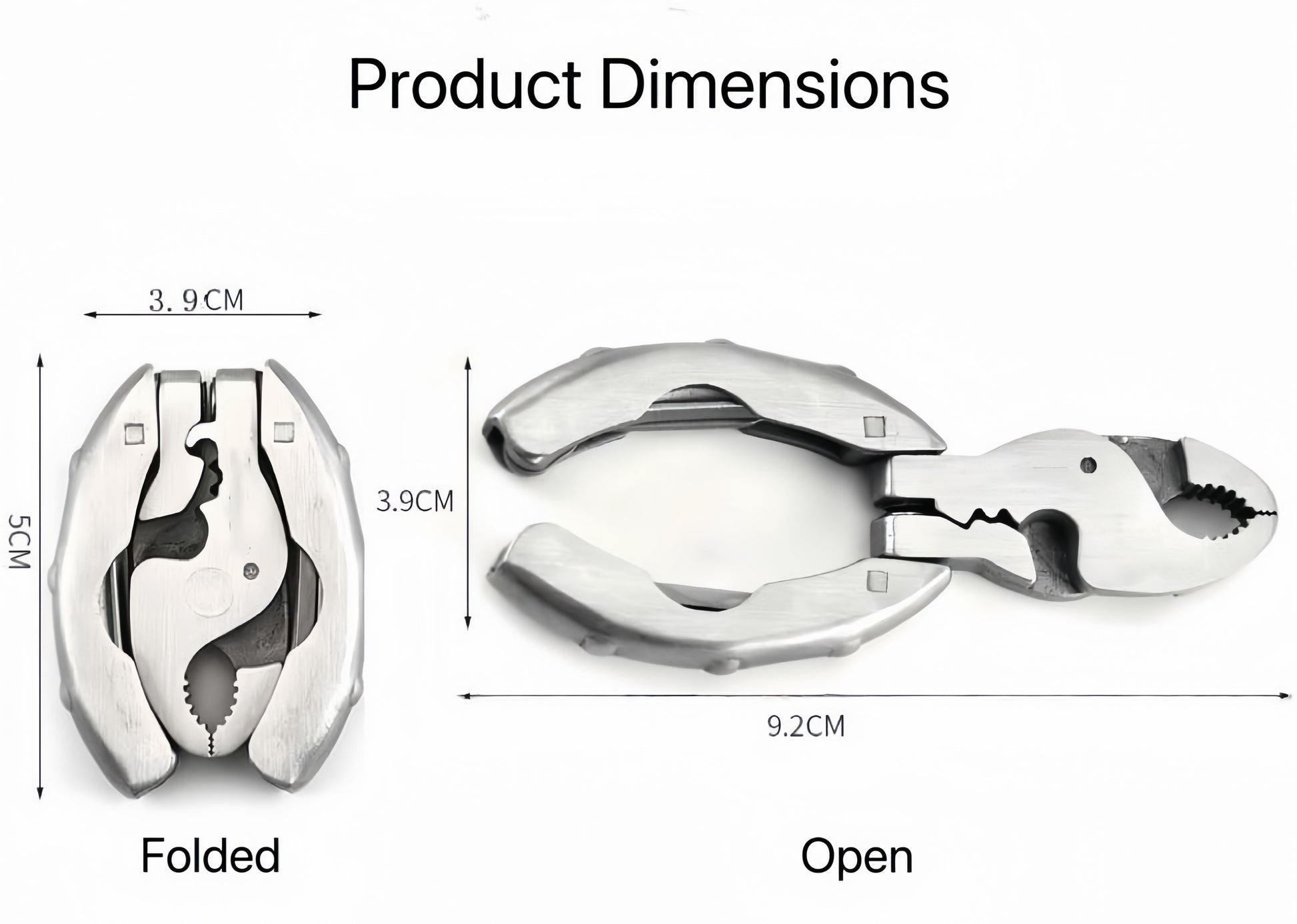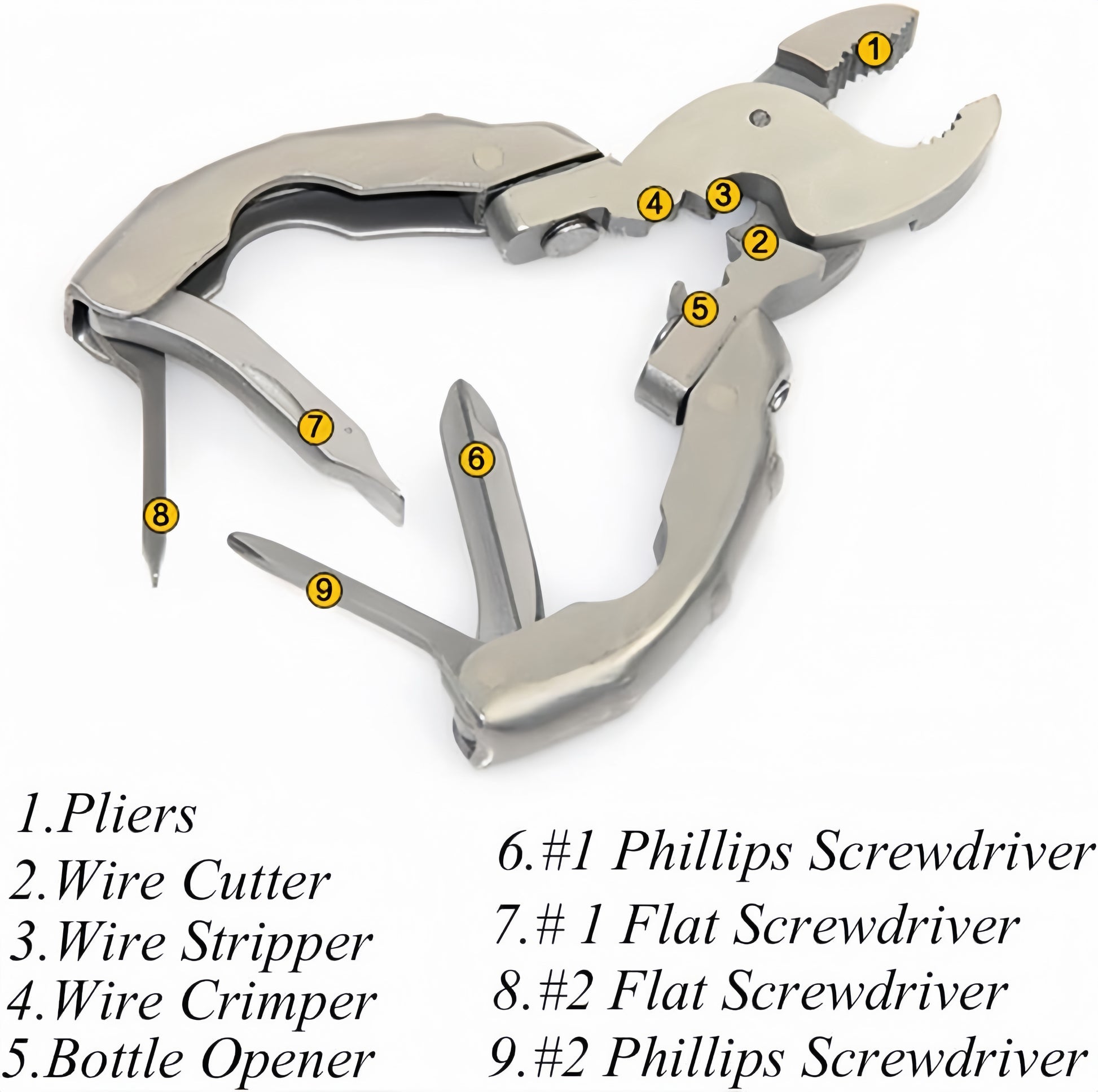 9 practical functions: Includes pliers, wire cutter, wire stripper, wire crimper, bottle opener, 2 Phillips screwdriver sizes, and 2 flathead screwdriver sizes.