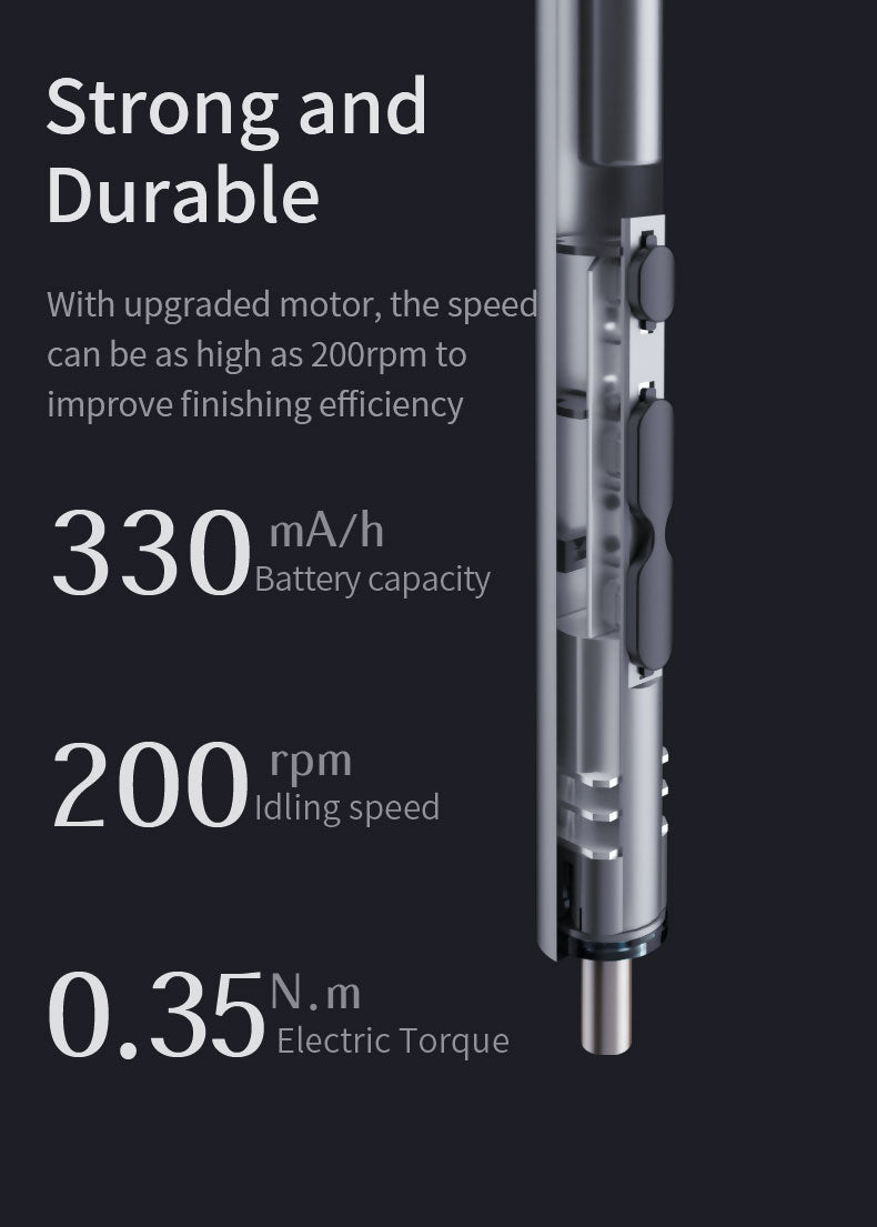Driven by a metal gear system delivering 0.25–0.35 N·m of torque at 300 rpm, it offers the perfect balance of power and precision. The built-in 350 mAh rechargeable lithium battery charges via Type-C in about an hour and provides up to 3 hours of continuous use.