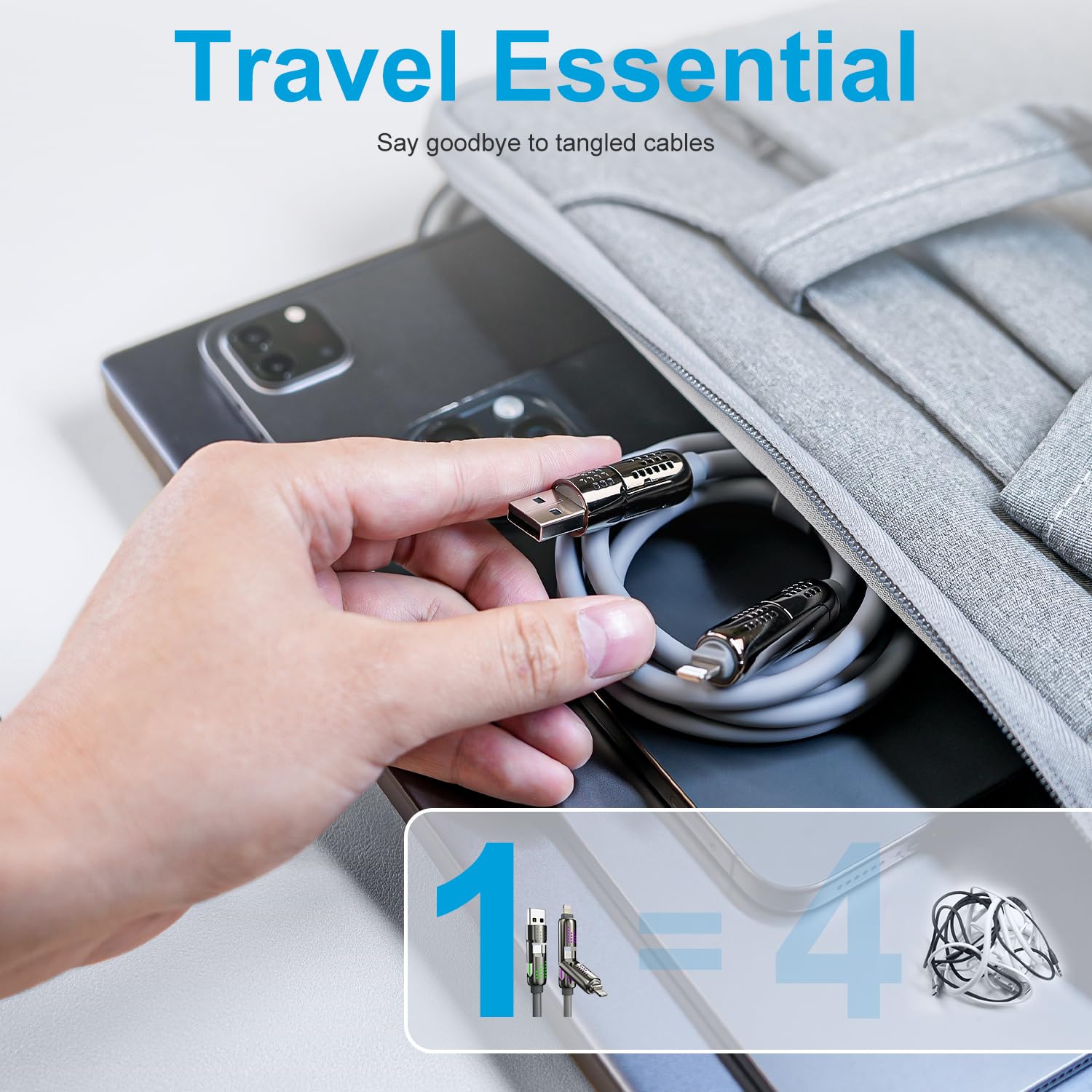 Say goodbye to carrying multiple tangled cables. The UniCore 240W 4-in-1 Fast Charging Cable is a sleek, intelligent all-in-one solution that works with all chargers and powers every device—all in one clean design. It combines USB-A and USB-C inputs with USB-C and Lightning outputs, giving you four charging combinations in a single cable—perfect for all iPhones (old and new), iPads, MacBooks, Samsung and Android phones, EarPods, tablets, and even the latest Switch 2.