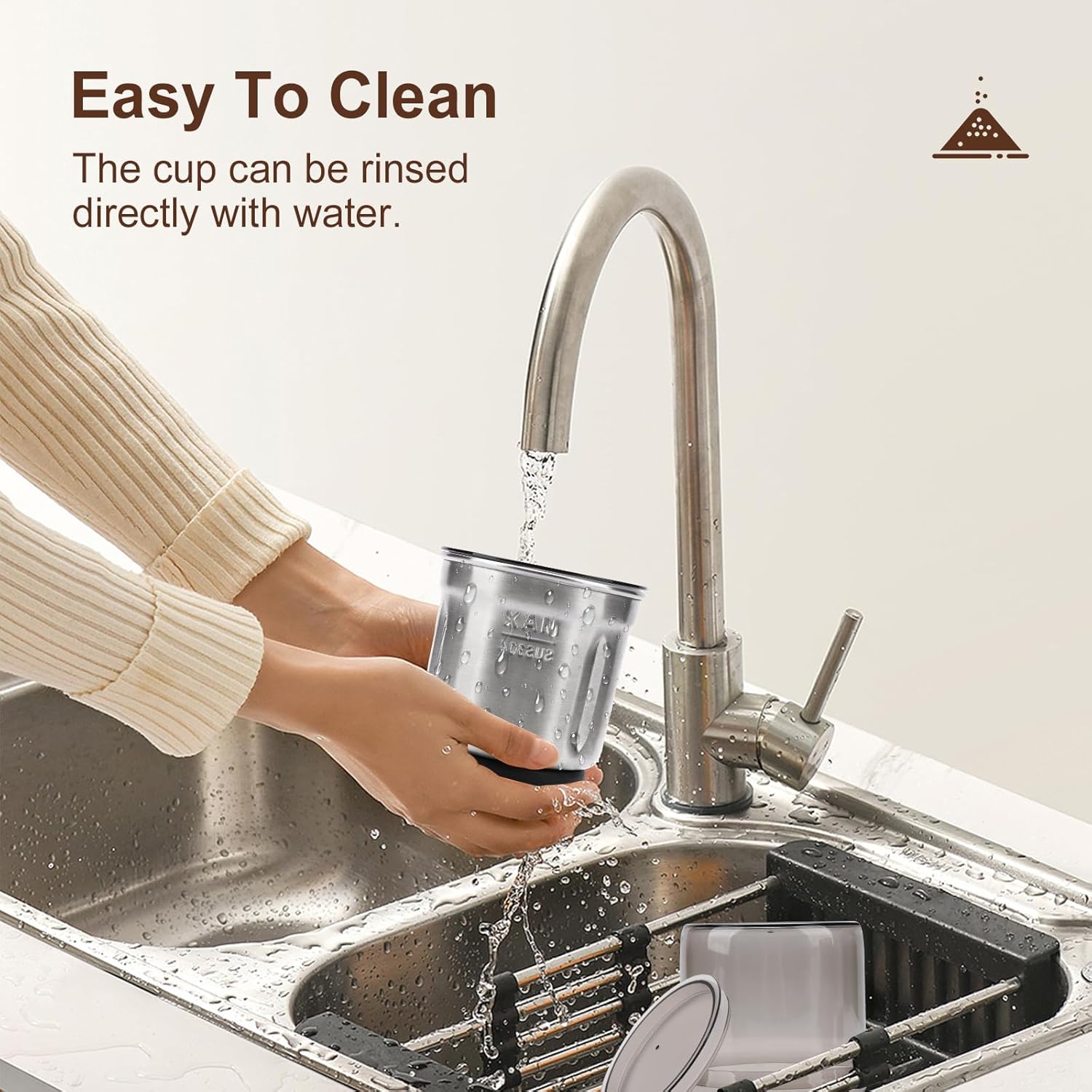 Detachable and water washable, the stainless steel cup can be rinsed directly after use, making cleanup quick and hygienic. The included brush helps sweep out any remaining grounds, while the compact build and detachable power cord make storage simple and space-saving.